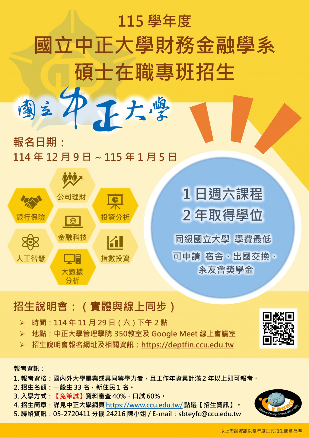 轉知國立中正大學財務金融學系碩士在職專班115學年度招生宣傳海報