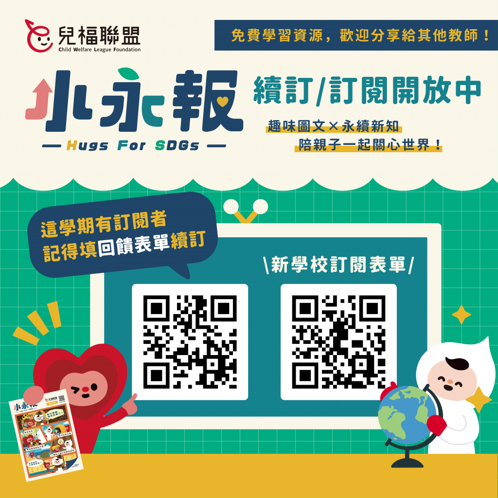 「SDGs兒童刊物:小永報」校園刊物續訂及免費申請辦法 (一)、小永報是一份以 SDGs 17項永續指標為基礎,轉譯國內外報導、連結學生生活議題,每期編排永續故事、思考問答及微型桌遊等單元,內文皆有注音,適合低中年級閱讀。114學年度上學期之小永報已於十二月初寄送完畢,下學期將進行刊物發行調整,由雙月刊改為月刊,同為月初出刊,逢寒暑假不寄送。 (二)、若您先前已訂閱過共讀紙本小永報、於上個學期已收到紙本之學校或班級教師,請務必於2025年12月31日前繳交回饋紀錄表,即完成下學期之續訂,若未繳交則會取消下學期之紙本寄送,詳細回饋格式與上傳表單請參: https://lihi.cc/BmcGE 。 (三)、即日起亦同步開放新學校申請114學年下學期之「小永報」校園共讀紙本,申請期限至115年1月16日截止。 (四)、為期待了解各校永續教育資源之需求,並發掘校內永續資源應用或創意議題教學,114學年申請辦法為「採先申請使用,後續於學年末分享回饋紀錄,即可免費申請及續訂下一學年之刊物」。詳細申請辦法及回饋紀錄格式,請參訂閱表單: https://lihi.cc/X19sK 。 (五)、共讀紙本限量開放,並以舊學校續訂為優先,敬請各校評估需求提出申請份數。如超過方案申請份數,將依填寫時間排序並通知未申請成功之申請人,填寫後無論是否成功訂閱紙本,都會定期收到電子書之更新信件,敬請善用小永報電子書,線上提供下載列印,亦有更多元的互動知識百科及影音動畫內容。如學校或班級教師為規劃永續課程教學,有單期過刊份數之需求,請洽詢:sdgs@cwlf.org.tw 或 (02)2558-6625分機53、12。 |
