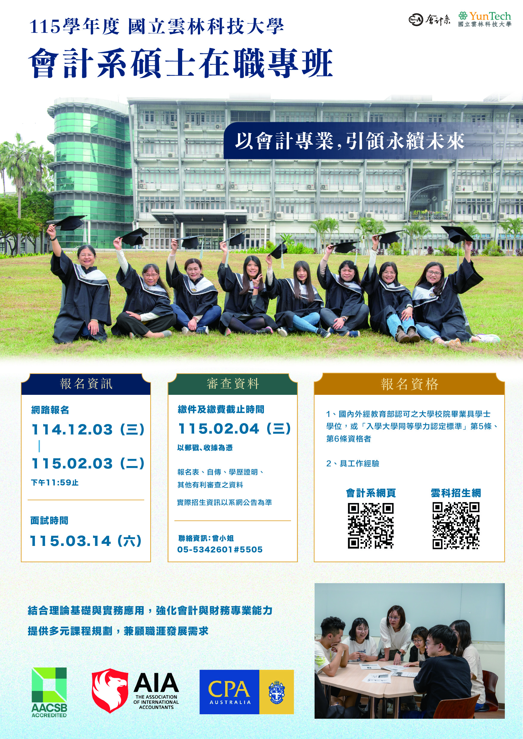 一、本校會計系碩士在職專班招生網路報名時間:即日起至115年2月3日(二)下午11時59分止(一律採網路報名)。簡章下載及報名網址:https://examweb.yuntech.edu.tw/WebExams/Exam_W/