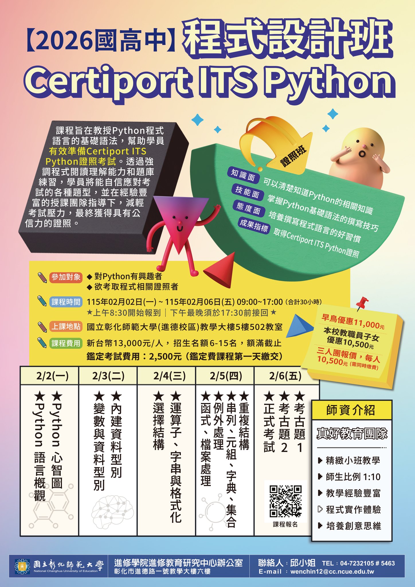 轉知國立彰化師範大學進修學院推廣教育「【2026國高中程式語言】Certiport ITS Python程式設計班」、「日語會話五十音基礎班」、「日語N3中級Ⅱ班」招生簡章