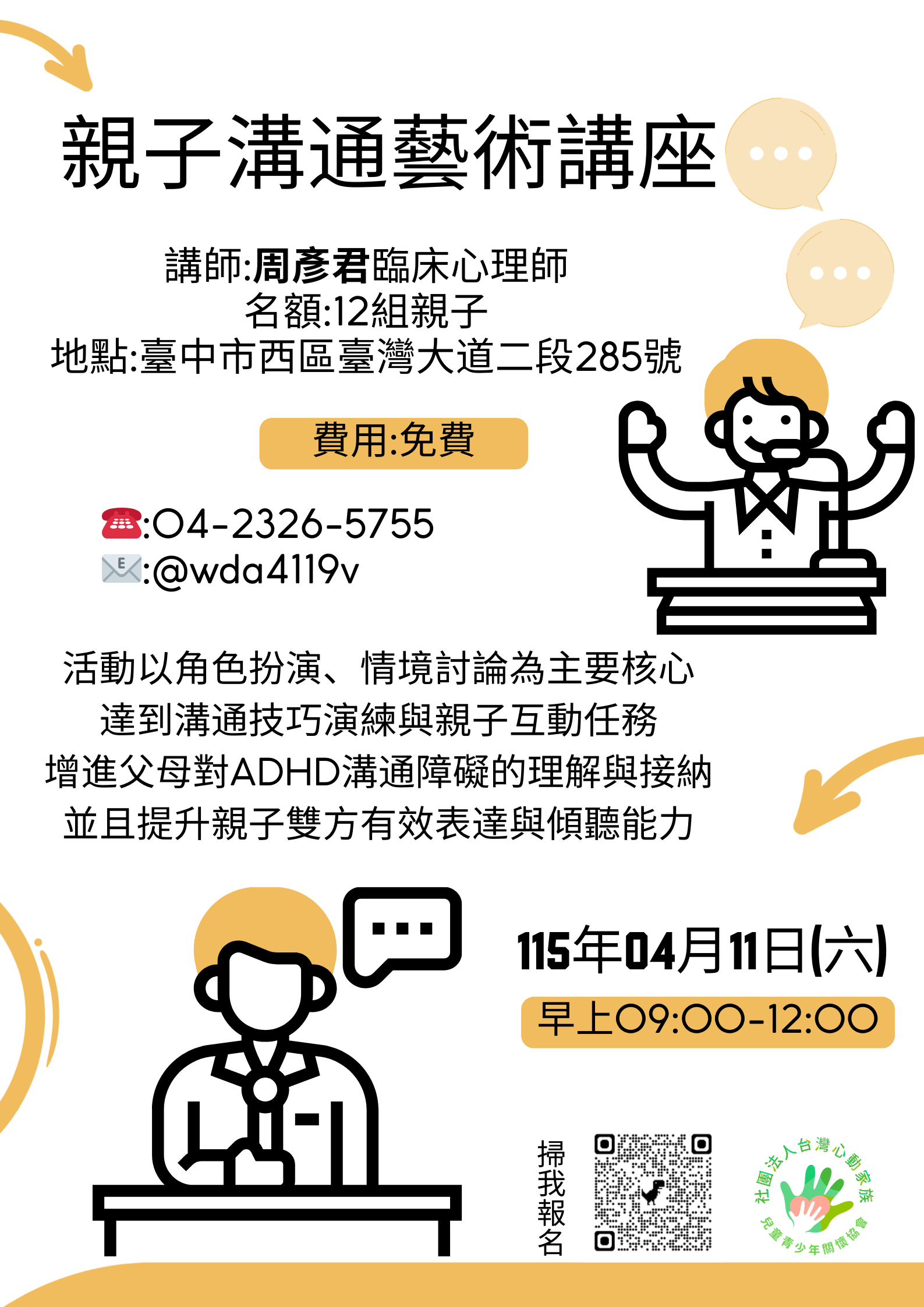 一、本會長期關注注意力不足過動症(ADHD)兒童青少年之心理健康與人際適應議題,規劃辦理一系列免費之教師研習及家長教育活動。