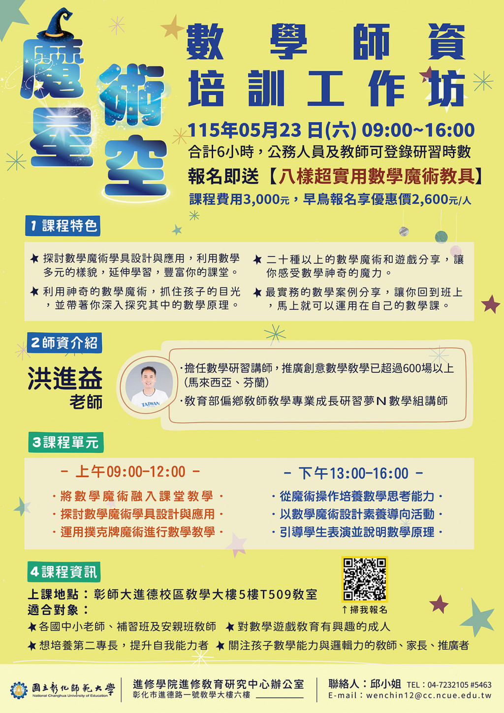 轉知國立彰化師範大學進修學院推廣教育「魔術星空數學師資培訓工作坊」、「課後才藝安親照顧培訓師乙級鑑定輔導班」、「115年中小學教育領袖經營素養增能班」招生簡章