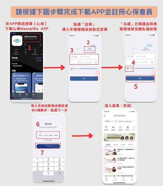6、演講過程中將會使用【心保app線上量表操作】,請講座前下載app並完成註冊,操作步驟詳如附件二。